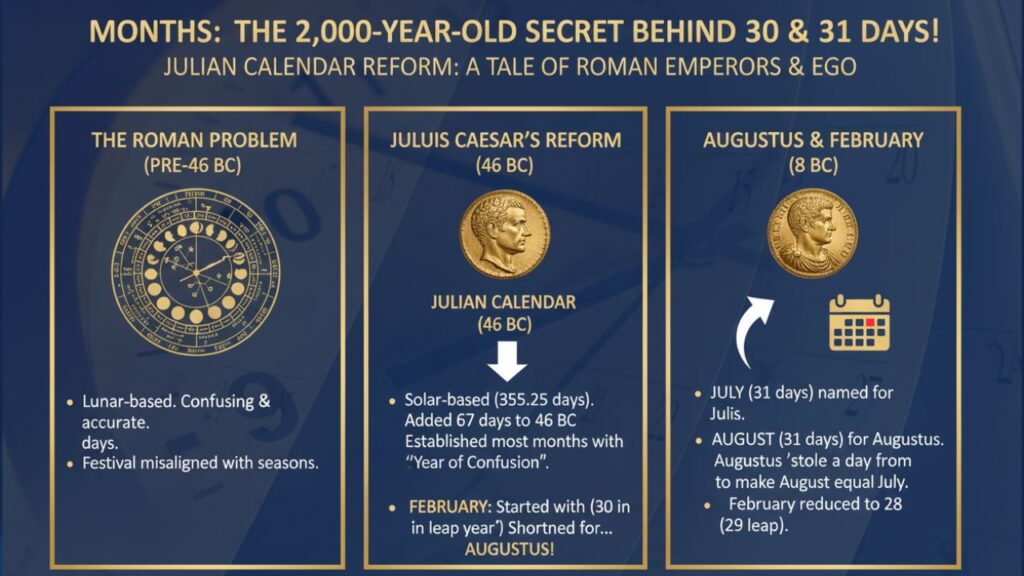 আমরা আজ যে মাসগুলো ব্যবহার করি (জানুয়ারি, ফেব্রুয়ারি, মার্চ…) সেগুলোর উৎপত্তি সরাসরি প্রাচীন রোম থেকে। তবে জুলিয়াস সিজারের সংস্কারের আগে, রোমান ক্যালেন্ডারটি একটি সম্পূর্ণ বিশৃঙ্খল অবস্থায় ছিল।